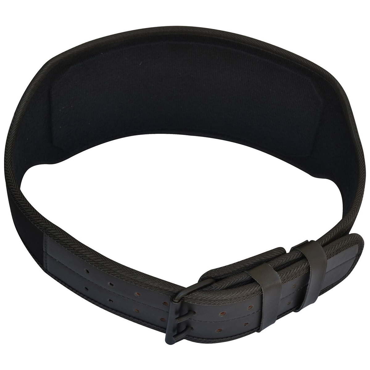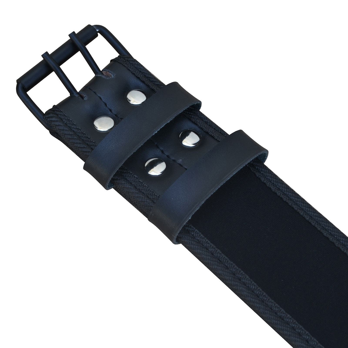 Powder coated double prong iron roller buckle and double loops to secure the belt tabs.